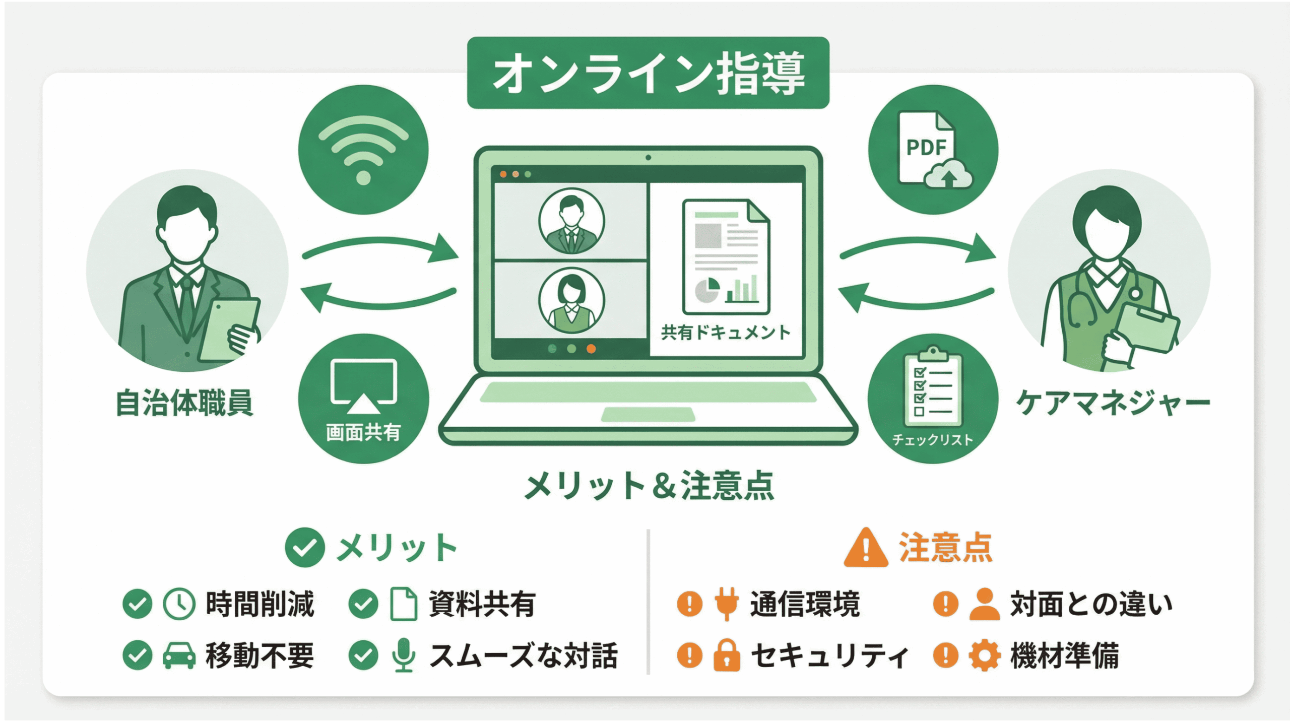| 行政側 | ・移動時間の削減により、より多くの事業所を指導できる ・効率的な書類確認が可能 |