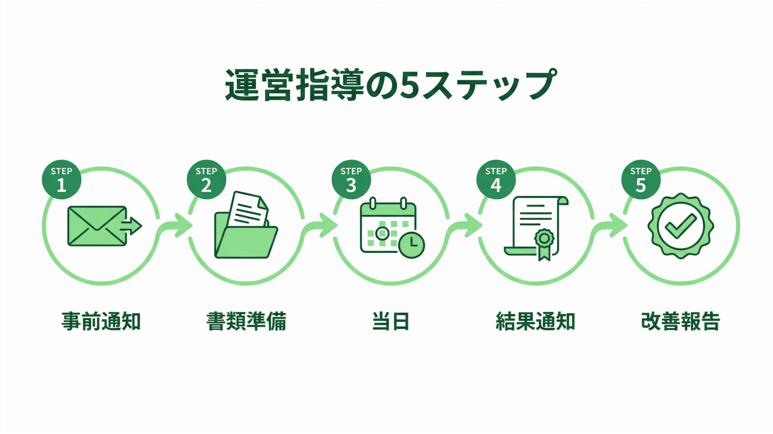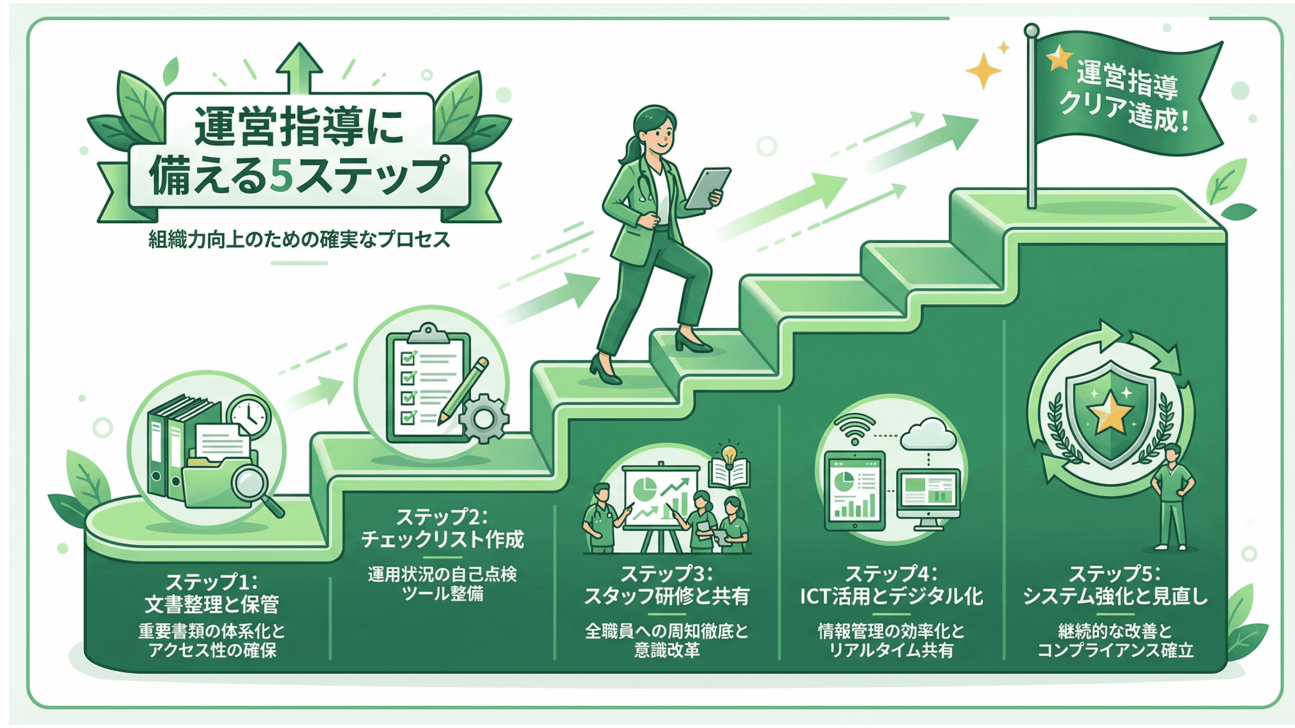 ここまで解説してきた内容を踏まえ、「いつ運営指導が来ても大丈夫」な体制を構築するための5つのステップをまとめました。明日からすぐに取り組める内容ですので、ぜひ実践してみてください。