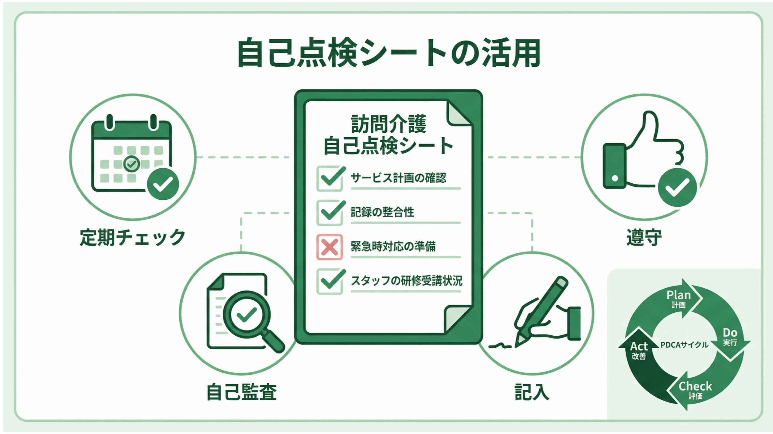 運営指導への備えは、決して特別なことではありません。利用者一人ひとりに対して丁寧なアセスメントを行い、適切な訪問介護計画書を作成し、計画に基づいたサービスを提供し、その内容を正確に記録する。この「当たり前のサイクル」を確実に回すことこそが、最も効果的な運営指導対策です。