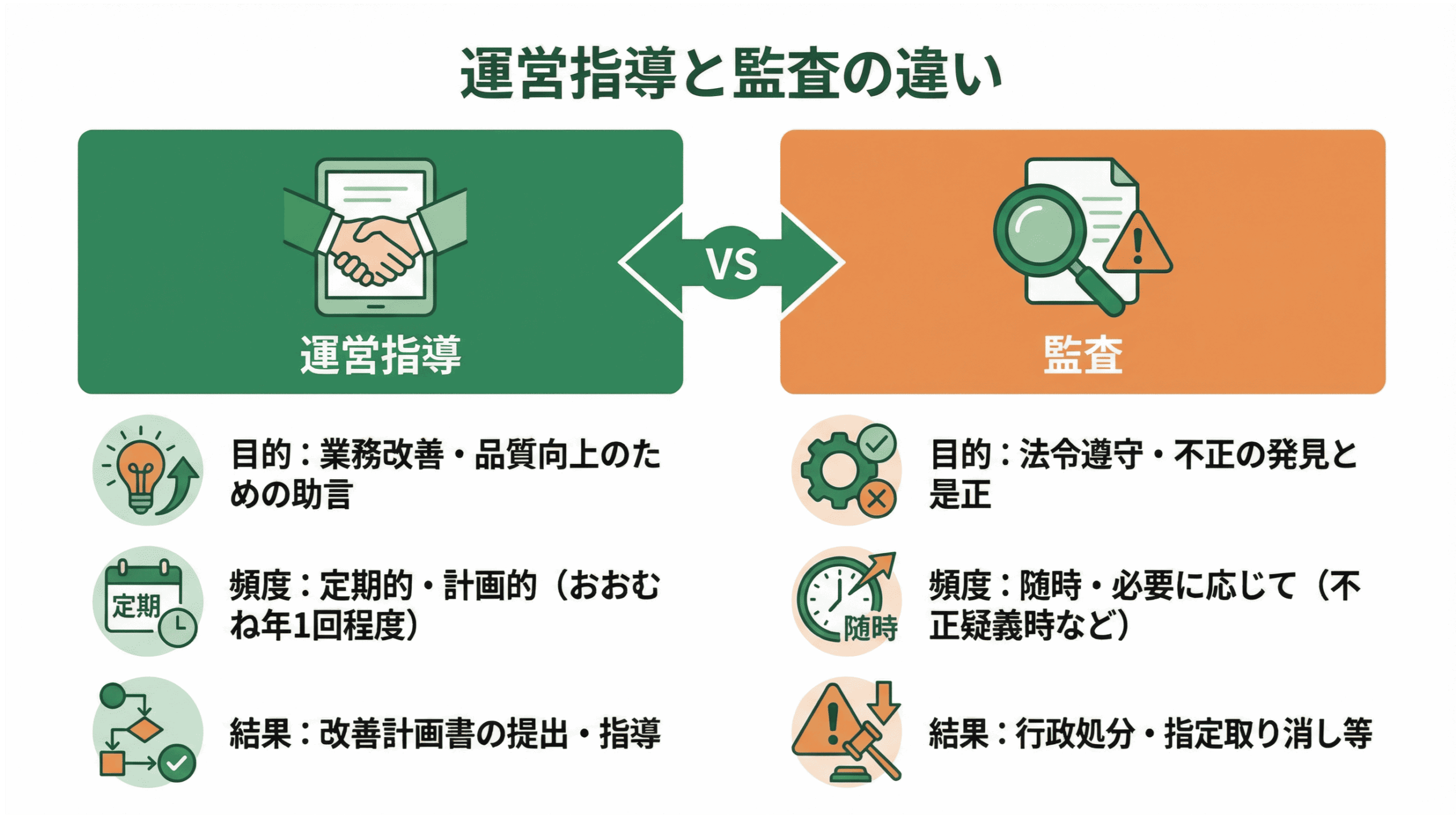 運営指導と監査の最も大きな違いは、「目的」と「法的効果」にあります。運営指導はあくまで「適正な運営の確保」を目的とした行政指導であり、法的拘束力はありません。一方、監査は「違反・不正の事実確認」を目的とした行政調査であり、その結果に基づいて行政処分が行われる可能性があります。