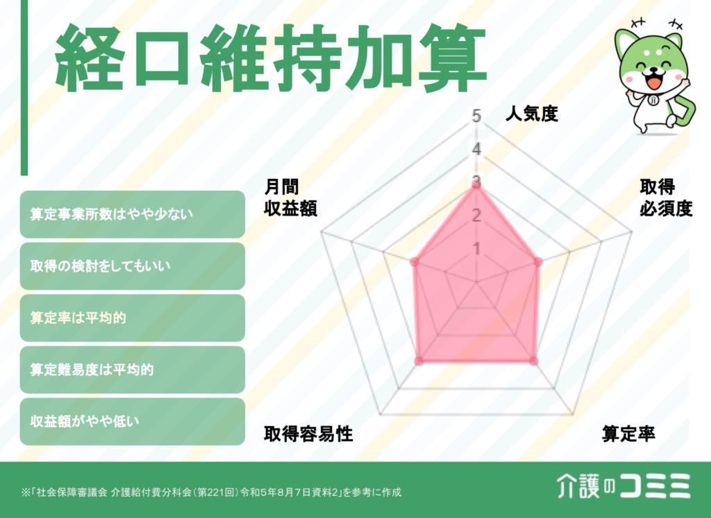 また、「介護給付費分科会」のレポートを元に、算定難易度取得おすすめ度などを独自調査し、5段階評価を行いました。