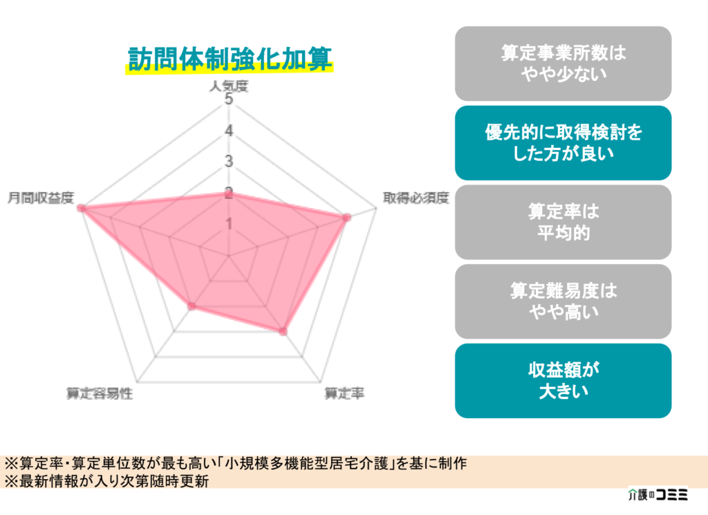 複数名訪問加算は、収益額が大きく、加算の算定率は平均的な傾向にあります。加算の取得を優先的に検討することをおすすめします。