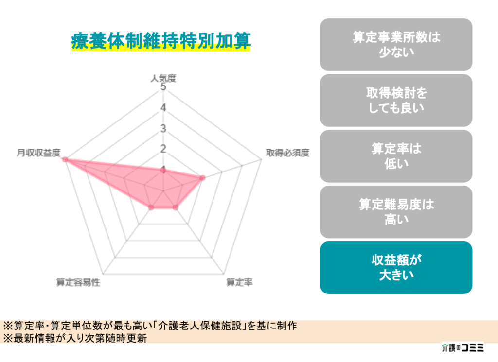 療養体制維持特別加算は収益額が高く、加算の算定率は低い傾向にあります。