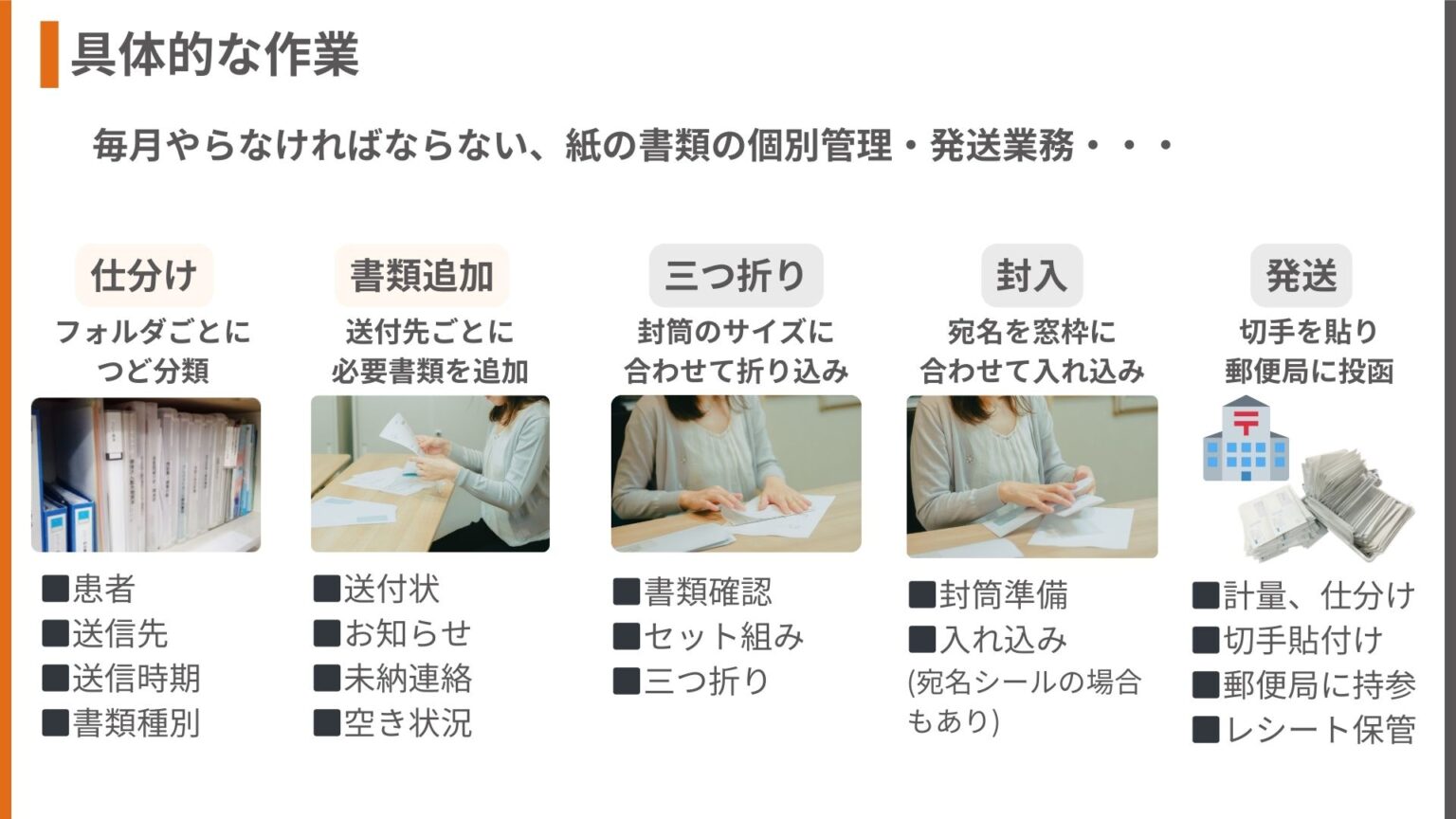 書類の送付処理のために発生するさまざまな手作業を自動化。