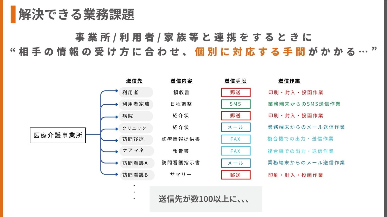 医療・介護の現場では、FAXや郵送での書類提出、連携先ごとの情報管理、二重入力など、時間を要する業務が少なくありません。