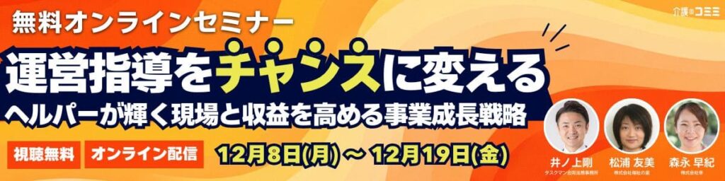 12月8日(月)〜2025年12月19日(金)に、「運営指導をチャンスに変える〜ヘルパーが輝く現場と収益性を高める事業成長戦略〜」と題した無料オンラインセミナーを開催いたします。